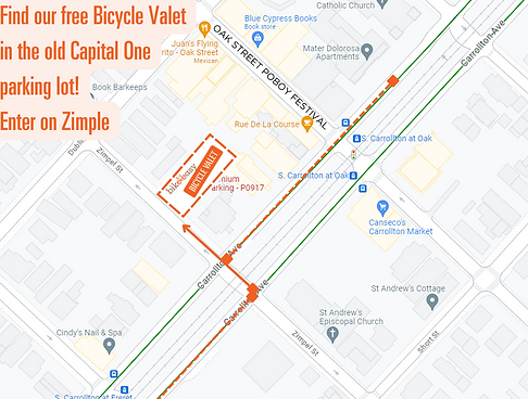 The Oak Street Po-boy Festival proudly hosts a free, staffed, bike valet located blocks from the festival at 1100 S. Carrollton next to Thibodeaux's Floral Studio. Click here to learn more about Bike Easy. See map below.​​​​​​​